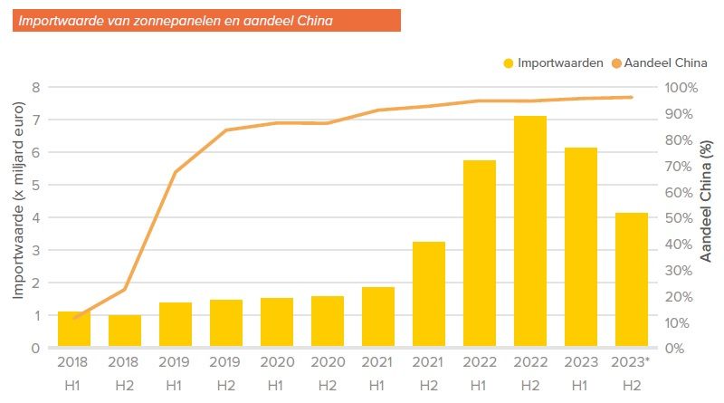 Bovendien werden in 2022 en begin 2023 voorraden aangevuld en uitgebreid waardoor de importwaarde toen hoger was. In 2023 was 96 procent van de importwaarde afkomstig uit China, terwijl dat in 2022 nog 95 procent was.