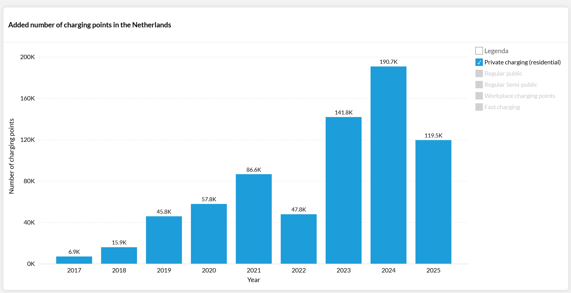 Volgens de laatste cijfers van Dutch New Energy Research (DNE) zijn er zo’n 120.000 opladers in de private sector bijgekomen in 2025 tot eind augustus. In 2024 waren dit er 190.000. Het lijkt er dus op dat de groei in het aantal laadpalen in 2025 iets afvlakt. Dit kan te maken hebben met het feit dat ook de markt voor elektrische auto’s in 2025 iets lijkt te stagneren.