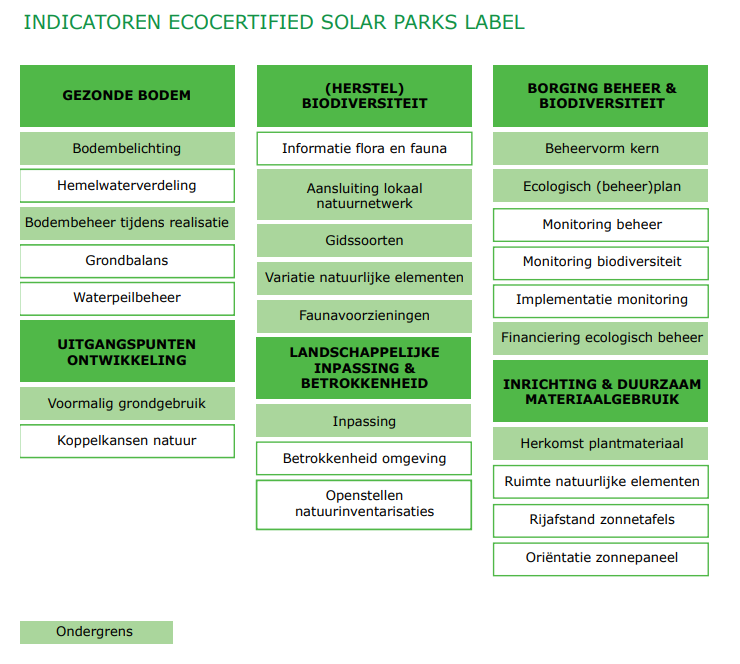 Na vier jaar onderzoek op achttien zonneparken zijn zes richtlijnen ontwikkeld voor het Ecocertified label: Uitgangspunten ontwikkeling , landschappelijke inpassing & betrokkenheid, Inrichting & duurzaam materiaalgebruik, gezonde bodem, (herstel)biodiversiteit en Borging beheer & biodiversiteit. De thema’s zijn onderverdeeld in 25 indicatoren.