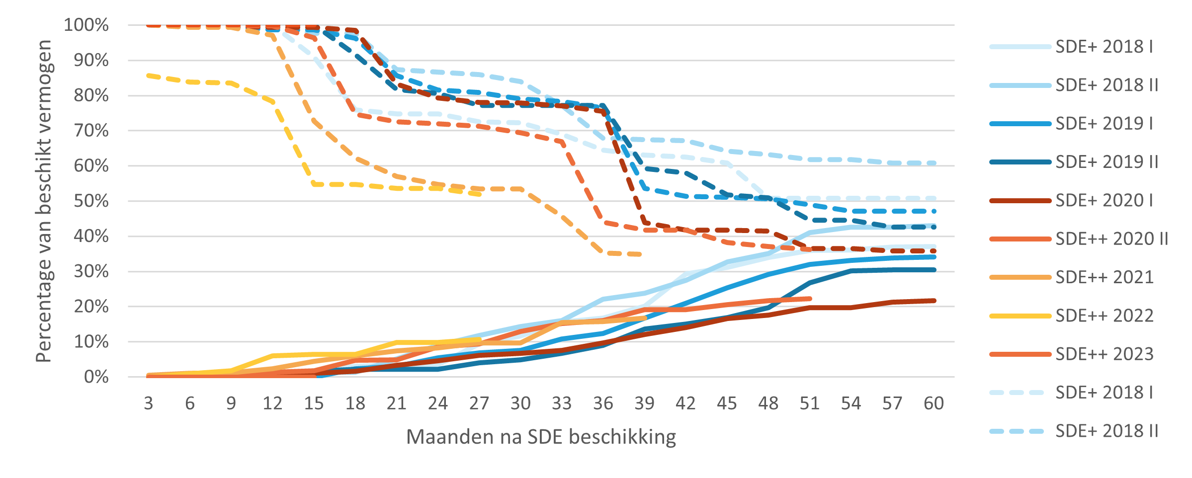 Bij projecten op daken kleiner dan 1 megawattpiek valt op dat het slagingspercentage in de subsidierondes van 2018–2019 op 40–50 procent lag. In de rondes van 2020 en 2021 was dit lager, tussen 18 en 27 procent. Op dit moment heeft de subsidieronde van 2022 een slagingspercentage van 22 procent. Gezien het aandeel stopgezette projecten van 37 procent en het gebruikelijke aandeel projecten dat in de administratieve fase blijft hangen, is het aannemelijk dat het uiteindelijke slagingspercentage vergelijkbaar zal zijn met dat van de SDE+-ronde van 2020, namelijk tussen 25 en 30 procent. De realisatie van projecten uit 2023 is nog nauwelijks begonnen en slechts een zeer klein deel van deze projecten is stopgezet.