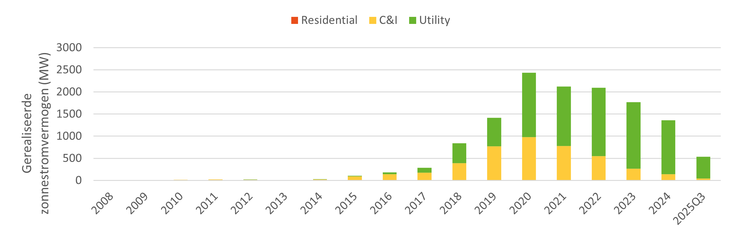 Residentiële zonne-energieprojecten ontvingen tot 2015 SDE-subsidies, waarbij de focus eerst lag op commerciële en industriële projecten en later op projecten op utiliteitsschaal. De totale geïnstalleerde capaciteit van gesubsidieerde projecten zag een piek van 2,4 gigawatt in 2020, waarna de capaciteit van gesubsidieerde projecten begon af te nemen tot 2024, in dat jaar werd er 1,3 gigawatt geïnstalleerd. Ten opzichte van 2024 is er in de eerste negen maanden van 2025 532 megawatt aan gesubsidieerde projecten gerealiseerd. Als deze trend zich voortzet, zou de realisatie van nieuwe PV-projecten in 2025 met 50 procent kunnen dalen ten opzichte van 2024, waarmee het onder het niveau van 2018 komt.