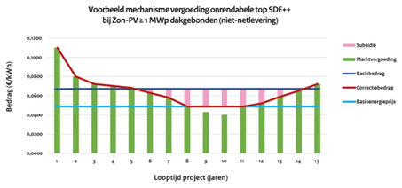De overheid wil de opwek van duurzame energie aanmoedigen door de Stimulering Duurzame Energieproductie en Klimaattransitie ofwel de SDE++. De subsidie wordt uitgegeven over de gehele exploitatieperiode van de installatie. De hoogte van de subsidie wordt berekend over de onrendabele top. Voor zonne-energieprojecten houdt dit in dat als de kilowattuurprijs op de markt zakt onder de kosten voor het uitbaten van de installatie, de overheid het tekort aanvult (zie figuur 1). De exacte voorwaarde van de SDE++ zijn afhankelijk van in welke ronde er aanvraag wordt gedaan.