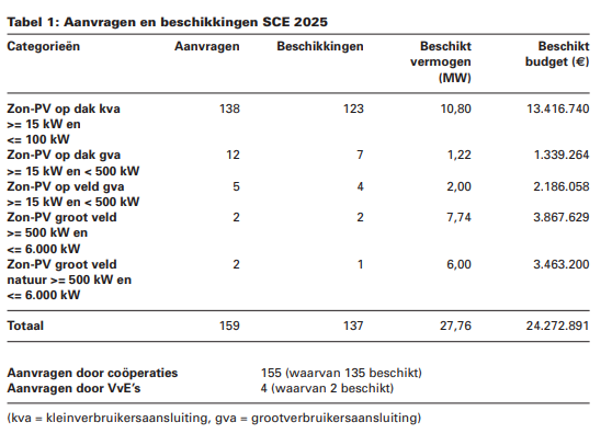 In 2025 zijn er 137 subsidies verstrekt binnen de SCE, bijna uitsluitend aan energiecoöperaties. Ruim de helft van de aanvragen en het budget gingen naar relatief kleine installatie van 15 tot 100 kilowatt. In deze categorie werden 123 subsidies verleend voor gezamenlijk ruim 13 miljoen euro. Samen tellen die projecten op voor 10,80 megawatt.